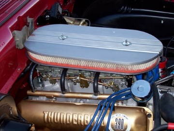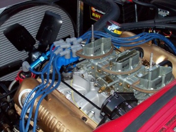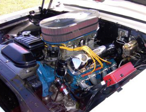 | Gerald Kenny's car is a 1957 Custom 300 with station wagon Custom trim. He put a rebuilt frame under the car in 2003 with 1977 LTD II disc brakes and a 9 inch Traction Lock rear. The motor is, for the most part stock with a cross ram intake and a couple of 650 cfm carbs; Mallory HyFire IVc and matching 29440 coil. Exhaust is handled by a set of FPA shorty headers. |