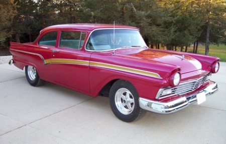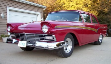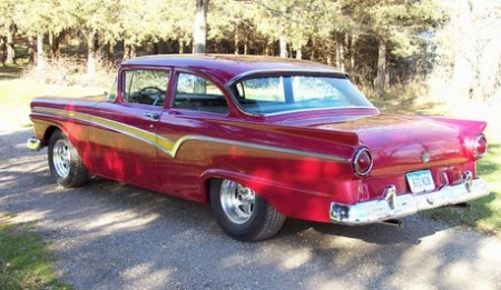 | This eye catching 1957 Custom 300 is owned by Jim Weber who hails from New Hartford, IA. His car was just completed and features a hi-po 390 with 401 Horsepower; top loader four speed; 3.70 Detroit Locker with 31 spline axles; rack & pinion steering and disc brakes. I personally think this car is very tastefully done. Luv dem 57's. |