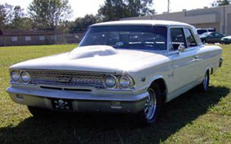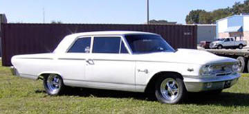| Bo Fabre is the proud owner of this 1963 Ford 300 with a .030 over 406 mill with tri-power; 11:1 Ross Flattop pistons: Lunati solid cam 300/310 duration; Hooker headers; 4 speed trans with 3.89 locker rear. Finishing touches include Crites glass hood & front bumper and Crager S/S mag wheels. |