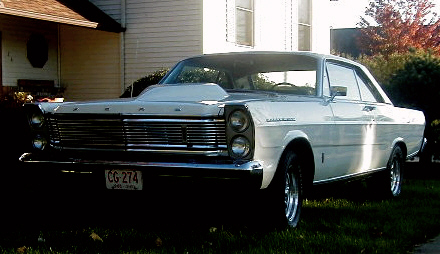 | David Florence aka "GalaxieGT" on the FE Forum is the proud owner of this 1965 Galaxie 500. It sports a .030" over 390 for a total of 396 cubic inches. (Tha block is actually a 428 service block bored to 4.08".) Heads are ported and polished C4AE low risers with Dove roller rockers; Milodon roller timing chain and topped by a Port-O-Sonic intake fed by a Holley/ProForm 780HP carburetor. Cam is a Crower hydraulic w/234 duration @ .050" lift. & .519 valve lift & Rhoades lifters. Rotating assy is fully balanced w/Speed Pro forged flat tops; CJ rods w/ARP bolts and std./std crank w/ windage tray. Crites long tube headers & 3" pipes back to DynoMax bullet mufflers that turn down in front of the rear end. Lakewood scatter shield; Ram custom clutch; narrow pattern toploader; Hurst Competition Plus shifter; 3.70 limited slip rear and urethane bushings round out the drive train. Body is mostly stock with Wimbledon white paint and a Crites fiberglass tear drop hood; some emblems shaved and Crager S/S wheels |