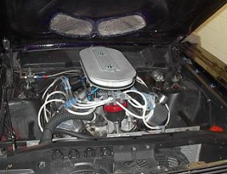 | Garry and Molly Catalano are the proud owners of this 1963 Galaxie 500. Power comes from a 427 low rizer dual quad motor. Tranny has been changed to an early big in, big out top loader with a Hurst shifter to improve the occasional red light runs. The car is equiped with early style traction bars and goes straight as an arrow. Exhaust is 2 1/2" with glass packs. The interior is red and white which really sets this car off against the black exterior. Be sure to check out their truck on the "TRUCKS" page. |