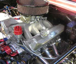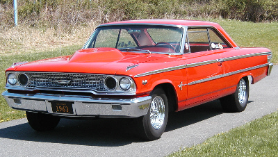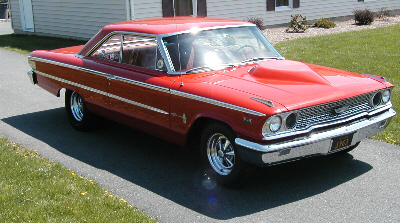 | It is with pleasure we present to you from New Jersey, Warren Kline's 1963 1/2 Galaxie with a 427 Center Oiler Stroker Motor. Motor is .017" over 427 w/ JE pistons; LeMans rods; CJ crank; Milodon pump& pan; Edelbrock heads & intake (ported & polished); Harland/Sharpe rockers; Demon carb; MSD distributor; Crites headers and Griffin radiator. Transmission is a 4 speed top loader w/ 2.78 first. Rear is a Detroit Locker with 3.70 gears. Dynoed @ 563 HP/537 Lbs. Ft. Torque. |