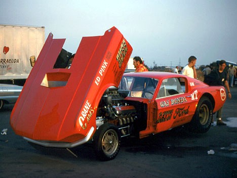 | In 1967 Gas Ronda replaced his Holman Moody built Russ Davis Mustang with this West Coast built '67 Mustang. He won many races with the poppy red Mustang including the '67 Manufacturers Race at Orange County. The car ran times of 7.90 sec. @ 184.04 mph with an injected cammer engine. despite the stock style body with removable front end and opening doors. (Photo by Mike Ditty; Information by www.draglist.com) |