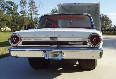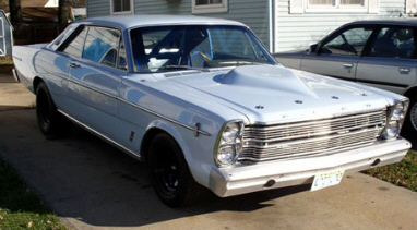 | I get excited every time I see a cammer under the hood of any car, or truck. Greg Lennon's SOHC baby blue 1966 Gal is one heck of a head turning sleeper. It was originally a 352 powered automatic fastback car, from N.C. The color is the original "baby blue" with the only changes to the body being a fiberglass hood and homemade aluminum bumpers. Power comes from an original cammer block bored .020 over with J&E 12.5:1 pistons; Crower rods w/ Chrysler hemi size big ends; Ford steel crankshaft and aluminum heads w/ solid S/S valves. Transmission is the big toploader 4 speed w/ a recently installed McLeoud street twin clutch. Greg says "I hope it will take the abuse. My last clutch did not like the torque very much." Cooling is provided by a Ron Davis racing radiator that Greg says are very nice and he recommends them. Since the car weighs 3700 pounds and there is an abundance of under hood power to get it moving quickly, stopping is handled by 12" Wildwood discs in front with twin master cylinders with an adjustable balance bar. |