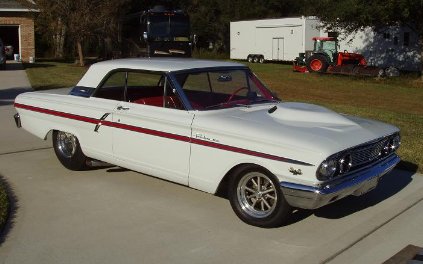 | This killer 1964 Fairlane is owned by R. Wayne Jeffers aka "RWJ." It is powered by an all aluminum Shelby block with 496 cubic inch displacement; Ford Perfect heads; Crower billet rods and crank; Crane Nitro cams; 58 mm throttle bodies on an original Ford intake w/ Fast EFI system. Transmission is a Jerico feeding a 4.30:1 nine inch rear with ladder bar suspension w/ Team Three wheels and M/T street slicks |
