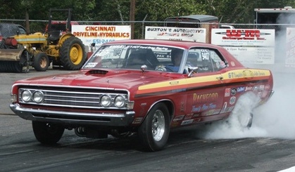 | Warren Douglas hails from Ottumwa IA. Here is his '69 Torino GT doing a burn out. It is powered by a .060 over 428 with a C-6 tranny w/shift kit. Intake is an Edelbrock Performer RPM with a 750 Holley on top and all nestled between a set of Cobra Jet "N" heads with roller rockers; hardened shafts and put into motion with a solid cam and fired by a Pertronix dizzy w/ MSD 6AL box. Exhaust is taken care of by a set of Hooker headers while the 4.56 rear w/ Detroit Locker gets things moving out back. |