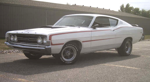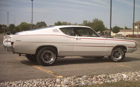 | Here is a 1968 Torino GT owned by Tony Olson. Under the hood is a .030" over 390 with a set of ported and polished 1960 352 HP heads that yield approximately 10.5:1 compression ratio. A dual quad setup from a '63 Galaxie sits on top of the mill and the cam is an Isky 280 Megacam. Transmission is a four speed feeding a 3.50 Trac Loc. Interior is black w/ bucket seats. |
