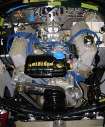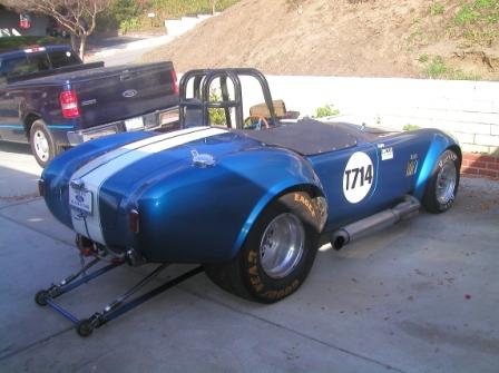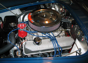 | This ERA 427 Cobra Replica belongs to Chuck Brandt. It was built to resemble the street version so his young kids wouldn't burn themselves on the side pipes. The engine is actually the 390 for his '66 F-100. It will get a 427 eventually. It took almost two years to build. Engine details are standard bore 390 made from a 352. Compression is 9.75:1 The cam is an Isky solid EE-360 w/ 278 advertised duration w/.530 lift on a 108 degree lobe center. Heads are C4AE-G w/CJ sized stainless valves and a little bowl work. Intake is an Edelbrock Performer RPM with a Holley HP 750 DP carb sitting on top. Ignition is MSD, and the trans is a wide ratio top loader. |