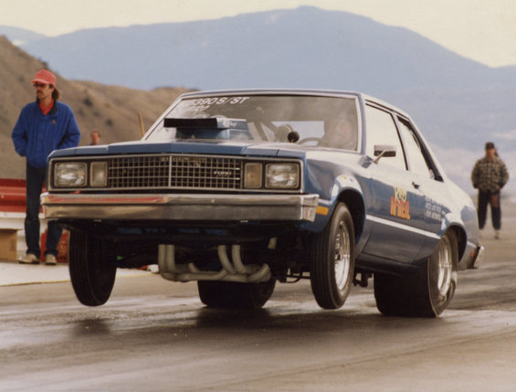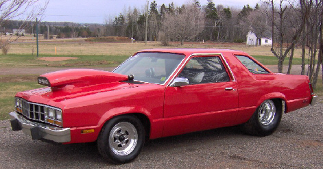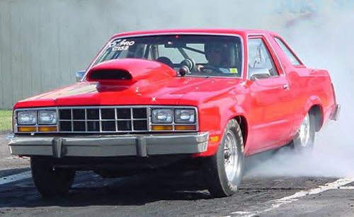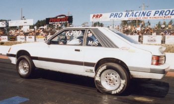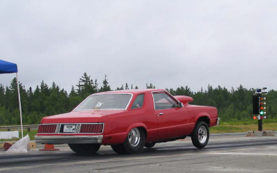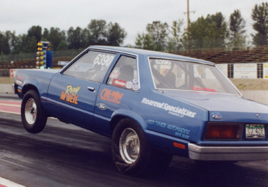 The car is a 1978 Fairmont 2 door sedan that started life as a Zero option 4 cylinder, 4 speed, manual steering, brakes and no radio. The car has a 2"X 3" frame back half from the firewall back with ladder bars and an 8 point roll bar.The car is all steel and has a fully carpeted interior. The engine is a .030" over 428 T Bird block with Speed Pro pistons on stock C7AE-B rods with 3/8" ARP bolts; stock .010" 1U 428 crank. The cam is an Oregon Cams solid lifter in the mid .600 lift, 266 duration using OE Ford "dumb bell lifters, ball & cup pushrods with Erson roller rockers. Heads are C8OE-N CJ units with some minor port and gasket matching. Current intake is an "out of the box" Edelbrock Victor, but the port matched Ford Sidewinder, with cut down center divider has gone the quickest ET's to date. Carb is a basically stock 3310 Holley 780 vac. secondary. Ignition is a Ford truck Duraspark dist. w/ MSD 6T box w/2 step rev limiter.Headers are 2" "sorta" equal length primaries w/ 3-1/2" collectors, custom made by Tom Posthuma. Trans is a 4 speed Jerico with Lakewood scattershield and McLeod clutch w/ aluminum flywheel. Dana 60 narrowed rear w/4.88 gears with Strange 35 spline spool, axles and chrome molly driveshaft. |