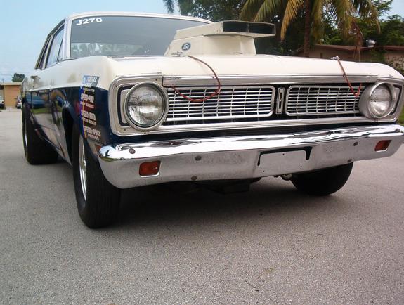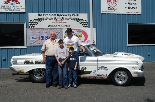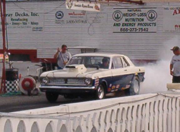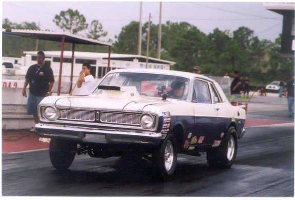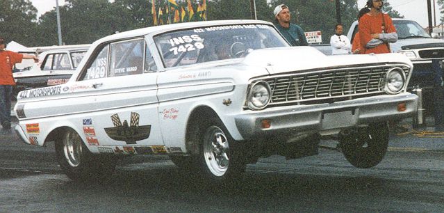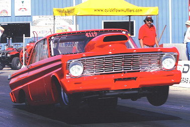 | "Fear Factor" is a 1964 Falcon formerly campained by Rich LaMont, but is now owned and driven by Steve Vargo of New Jersey. Some special features include 2 - 750 cfm Holley carbs; Headers by Lucky's Race Cars; and four speed transmission by Jerico. The wheels are Weld Pro Stars with M/T tires. Lubrication by Quaker State. |
