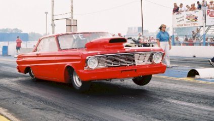 | The "Wild Child" is a classic example of a 1965 A/FX Falcon powered by a SOHC 427 (called Frogs by some folks, because of the way they would sometimes leap off the starting line with all four wheels off the ground). It is owned by Joe Germann and was raced under the banner of Rankin Ford. I could never do this car proper justice with the limited space on our pages, so please click on the link below to visit Joe's page. |