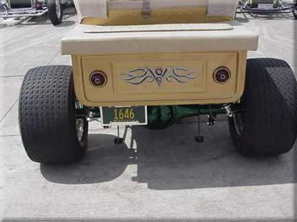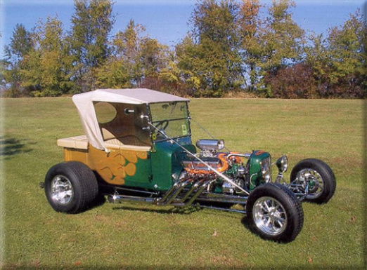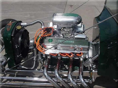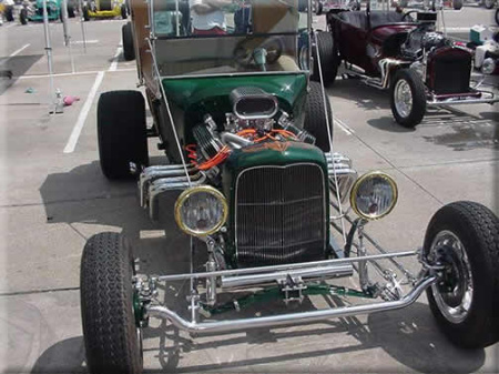 | Jerry "Lugnut" Chenot of Greenleaf, W I. is the proud owner of this T-Bucket powered by a 450 Horsepower 390 mill with Edelbreck heads and 3X2 Bbbl intake and carbs. Notice the highly polished stainless steel frame. AWESOME "T". |