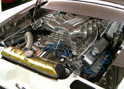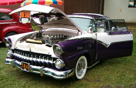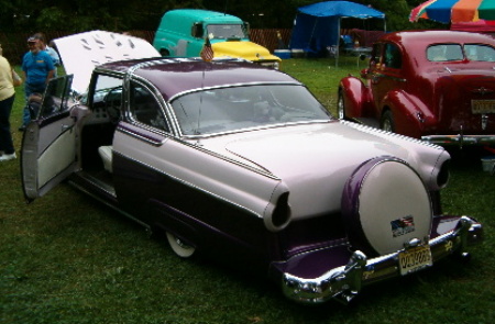 | Mario Rapetti is the current owner of this beautiful 1955 Crown Victoria custom that is powered by a 360 truck motor with all kinds of neat goodies hooked up to a four speed trans. Sure does turn a lot of heads . You can't help but want to look under the hood. I'll never tell. |