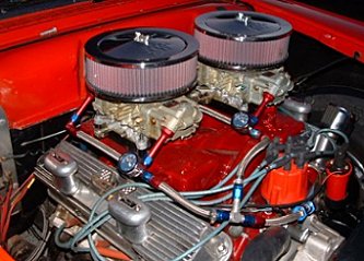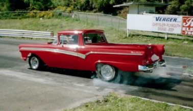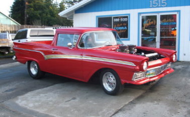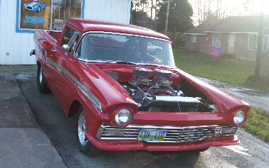 | This beautiful 1957 Ranchero has belonged to Louie Christensen for the past 32 years and is used mostly for cruises and car shows with some 1/8 mile drags thrown in just for fun. It ran 7.80s @ 88 mph before the dual quads were installed. It is powered by a 428 Cobra Jet engine bored .030" over w/ forged 10:1 pistons; Howard solid roller cam 244 @ .050" lift and .600 total lift; Harland Sharp roller rockers on Edelbrock aluminum heads. Between those heads is an Edelbrock X-F66 cross ram intake w/ stage 2 450 Holleys from Performance Carburetors. Fire is provided by an MSD 6+ Ignition. and the burnt gasses are exhausted by Tri-Y at the present time, but Hedman Hustler headers are coming this winter w/ 3" exhaust system. Water pump is an Edelbrock and the oiling chores are handled by a blueprinted HV/HP oil pump; Milodon 7 Qt pan & windage tray. Tranny is a Stage 2 C-6 w/ B&M Pro Ratchet shifter; 3000 TCI stall converter with Gear Vendors overdrive. Out back is a 9" rear w/ 4.56 gears; Detroit Locker; 31 spline Dutchman axles and Caltracts. |