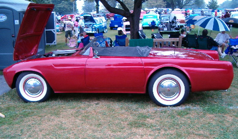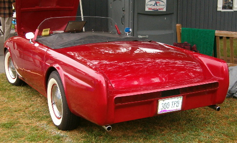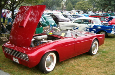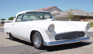 | Ken Smitly of Pennsylvania saw this car when it was for sale and said to himself; "I need that." This restyled 1955 Thunderbird was originally built around 1960 for a movie, but Ken has been unable to learn which movie it was supposed to have appeared in. It has pretty much been untouched from it's original condition except for the 427 FE motor which sports two four barrel carbs, four speed transmission, the custom made lexan windshield and the modernization of the brakes. It's a nice step back in time when restyling was quite popular during that era. |