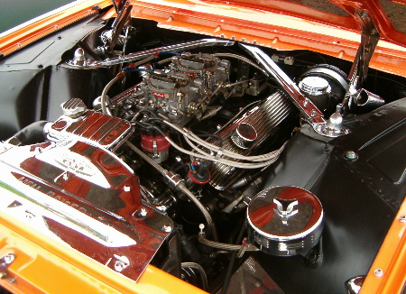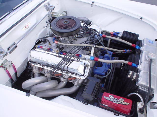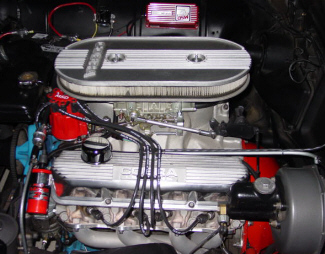 | Tom "Tommy - T" Moore is the proud owner of this immaculate "56 Thunderbird. The motor is a + .060 352 block (+ .010 390) with the same Edelbrock heads that were on his 428. It's got a Renegade Racing hydraulic cam that has 260/270 advertised duration (194/204 @ .050 lift) The cam has .458 Lift w/ 110 lobe centers with Harland Sharp roller rockers. Between the heads there is a Scotty Vincent ported Streetmaster intake with a 600 cfm vacuum secondary Holley on top. The trans is a C-6 automatic. A VERY narrow 9" Ford rear with Traction Lock and 3.50 gears round out the drivetrain. Nobody told this motor that it isn't a 428. Mom's car (although not an FE) is a peppy 312. |