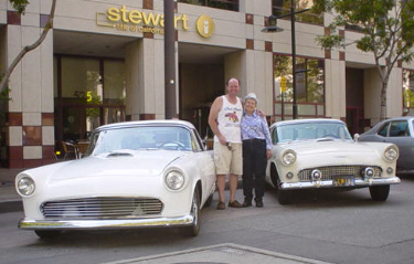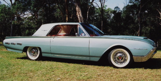 | Trevor & Carolyn Chapman's i962 Thundrebird Hardtop is another beauty from down In Australia way. The original 390 was replaced with a "C" Block 428CJ, bored .040" over, zero decked, crossbolted, tunnelled internal balance CJ rods with 13/32" SPS bolts, forged Speed Pro pistons, solid lifter Isky cam #EE-390 w/ 300 duration and .525 lift, Dove roller rockers, Smith Bros. pushrods, Vertex Magneto, rebuilt original Holley carbs on a tripower intake port matched to C2SE heads, 2.19 I & 1.73 E valves, oil system modified, oil pump mods, (Springs etc.) Canton T pan w/windage tray. The headers are homemade Tri-Y backed up by stainless 3" dual exhaust. Tranny is a C-6 with the "R" servo and 5 pack clutch and kit. 4.30 rear gears. The Bird still looks original. The red leather interior is perfect. The color is repainted original Silver Mink ( which is believed to be a very rare trim/paint combination. There is plenty of "Thunder in this Bird! |