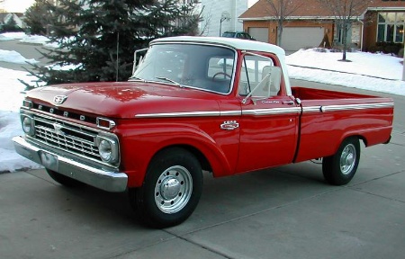 | Okay class, now pay attention. What kind of trucks are these? That's right. They are both Mercurys. The Red and white one is all stock long box '66 Custom Cab with a 352 mill and three on the tree restored in 1994. The all red truck is a '66 Merc Ranger short box with an all stock 352, auto trans, P/S, P/B, bucket seats and console. It was frame off restored in 2001. Owned by Rich Miller |