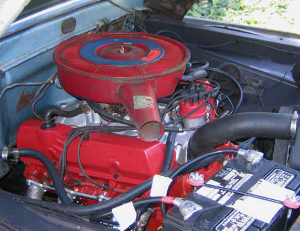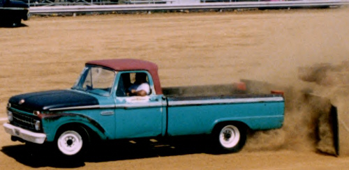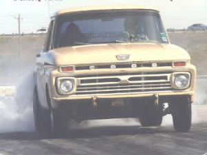 | Pippin Cavagnaro's 1966 F-100 "Redneck Battle Truck" is powered by a 410 c.i.d. mill with CompCams XE262 cam; Long rods; Custom machined pistons; stock parts, except for self ported heads. Tranny is a three on the tree until it wears out then it will get a top loader. Visit his site at www.motoextreme.com |