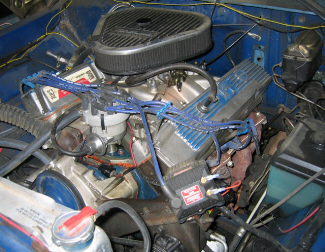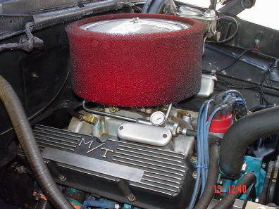 | Doug "Smitty" Smith's Hillbilly Truck powered by a 1963 Mercury Marauder 390 c.i.d. motor w/ factory Low Riser manifold; Crane solid cam w/ 227 degrees @ .050 lift & .523 lift; MSD Blaster ignition. Exhaust is handled by ceramic coated headers with Edelbrock RPM mufflers. |