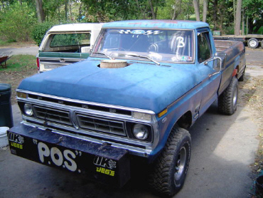 | My neighbor up the road, Nicholas Monn Sr.'s '76 F-100 Super Street Puller he calls P.O.S. It is powered by a .030 over 390 mill with a CompCams 292H cam with Crane roller rockers. Between the Edelbrock heads sits a Victor intake with a Demon 850 carb sitting on top. Headers are Homemade equal length fenderwells 2-1/8" into" 4". Trans is a T-18 four speed with a 12" Borg Warner clutch. Front Dana 44 w/ARB air locker and the rear is a welded 9". Both are 4.56 ratio |