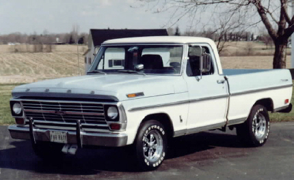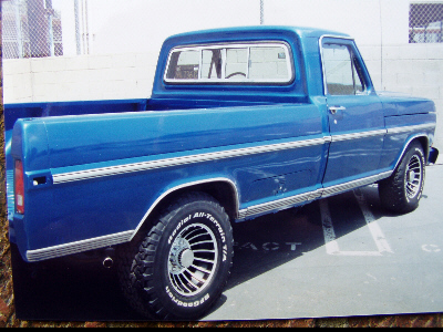 | Rapid Russ is the owner of this 1970 F-250. It presently has a mild 390 w/ C-6 with a soft locker rear. Plans are in the making for the motor to be replaced with a 433 c.i.d. cross bolted motor with 10:1 Probe forged pistons, CompCams XE284 cam w/ roller rockers, Scat H beam rods w/ ARP bolts, PSE Tunnel Ram with 2 650 Holleys on top. Custom full length headers from Accufab. Tranny will be a rollerized C-6 and the rear will get MW axles w/ 4.56 gears. Plus the truck will be on a serious diet. |