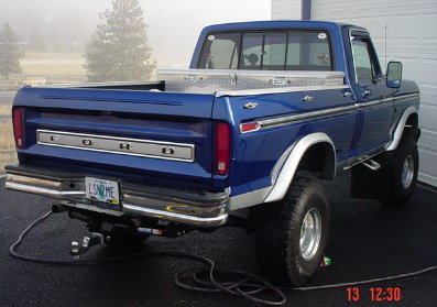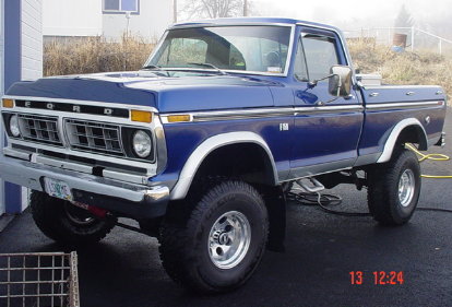 | Wes Adams is the proud owner of this 1976 F-150 4 X4 powered by a 1970 428 PI bored .030" over with Speed Pro forged 11:1 pistons; stock rods; standard 1U crank; C8AE-H heads w/ 2.09" & 1.65" valves & CompCams roller rockers w/ Custom Crower solid roller cam w/ .565 lift. Between the heads sits an Edelbrock F-427 manifold with a Holley 750 HP w/ Perform main body and Adjust-A-Jets on a 2" spacer; 5" K&N filter; Hooker headers; Spark is handled by a Mallory Unilite dizzy with MSD 6AL box and Super Stock coil. The truck has a 4" lift with 3" body; 3.50 gears and 35" tires and traction bars. Transmission is a NP435. |