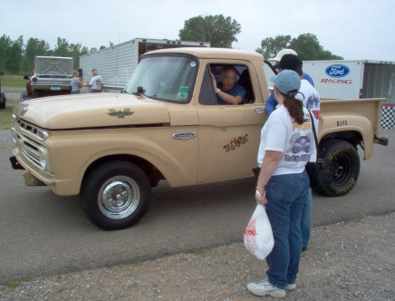 | Garry (CJCAT427) & Molly Catalano are the proud owners of this 1956F-100 It is powered by a 427 Medium Riser with long cast headers, 3" Stainless exhaust, 9" Ford Traction Loc rear with 3.73 gears and traction bars. The truck currently has a C-6 trans, but is soon to be changed to a toploader 4 speed. Garry has owned this truck for thirty five years and is presently rebuilding it for the third and final time. It will sport the same motor w/ 4 speed, new bed and big back window cab. The color will be changed from rangoon red to Ford Performance Red which is much brighter. I can't wait to see it in color. |