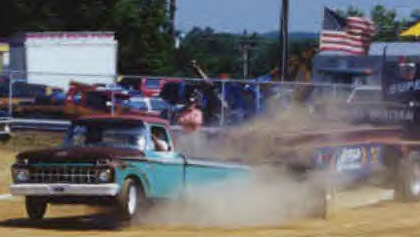 | Scott Vincent's Pulling truck is a 1965 F-250 that pulls in local 5,200 lb. 2 wheel drive Pro-Street Class. It is powered by a .060 over 390 w/11:1 TRW pistons, Lunati cam, C1AE heads, heavily ported Streetmaster intake w/ 850 Holley Double Pumper, Mallory UniLite Distributer, Dove roller rockers through a New Process transmission. Click on either of Scott's pictures to link to his site. |
