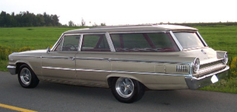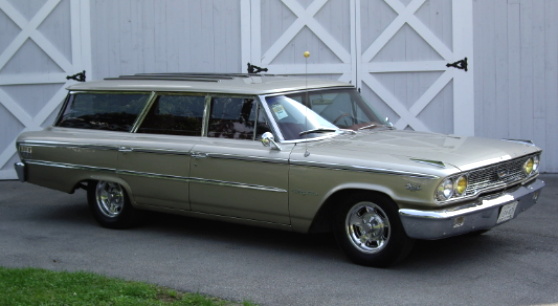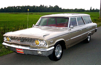 | From Granby, Que. Canada I present Andre Blaquiere's beautiful 1963 Ford Country Sedan Wagon. It started life as a 390 c.i.d. 300 HP w/cruise o matic. Today it sports a fresh 390 with a small cam; Police Interceptor aluminum intake with a Holley 600 cfm vacuum secondary carb; 427 long tube cast iron headers.and 3.45 rear. The suspension is dropped 1 1/2" with Torque Thrust wheels w/ Carlisle spinners. Bucket seats w/power drivers seat from a Galaxie XL. A four speed tranny is planned for next year. |